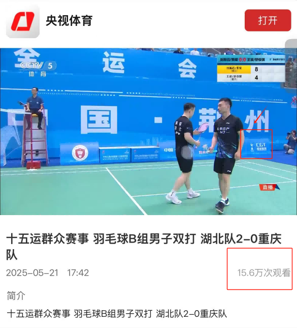 5月23日,第十五届全运会群众比赛羽毛球项目(单项)预赛在湖北荆州文化体育中心体育馆圆满收官,CCTV5体育频道现场直播进行报道,观看人数高达15.6万人次。作为赛事赞助商之一,德信·体育(DexinSports)官方网站(简称CGT绿城体育)以专业的体育服务与品牌力量,为赛事顺利举办提供了有力支持,展现了企业推动全民健身事业发展的责任与担当。